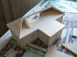 "Elimde bulunan 6 mm kavak kontrplaktan önce kuleyi oluşturan parçaları kestim. Kule sekizgen bir kesite sahip ve yükseldikçe incelen yani piramit şeklinde bir yapı. Her yüzünü ayrı ayrı kestim ve birleşme yerlerine pah kırarak kulenin alt kısmını oluşturdum. Balkon kısmından sonraki silindirik kısmı eski bir sprey kutusu kapağından yaptım. Üzerine sekiz adet delik deldim ve birer kuşgözü yerleştirdim."